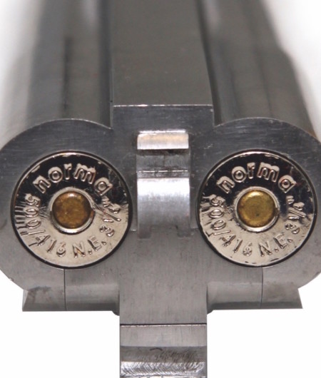 Um dies zu erreichen, wurde eine .500 Nitro Express 3 1⁄4“ auf einen .416er Durchmesser eingezogen, wobei sich aus der ursprünglich konisch zulaufenden Hülse eine Flaschenhalshülse ergab. Nach britischer Manier, bei der zuerst die Ausgangshülse genannt wird, wurde die Hülse dann auf die Kaliberbezeichnung .500/.416 Nitro Express getauft. Vorgestellt wurde das neue Kaliber 1996, von dem es inzwischen Fabrikmunition von Norma und dem Labor für Ballistik gibt. Die .500/.416 Nitro Express zeigt ein angenehmes Rückstoßverhalten. Sie schiebt zwar kräftig nach hinten, es ist aber kein kickender, durchgehender Impuls, wie man ihn von anderen .500er Kalibern kennt.